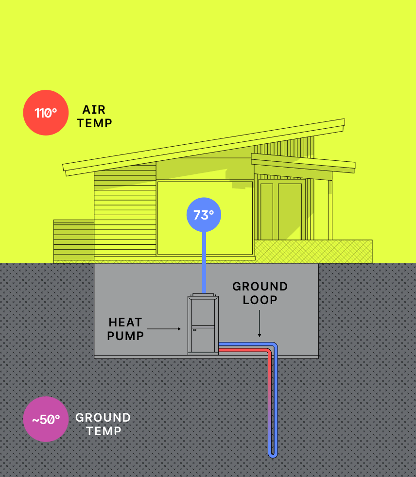 Warm air from the home is drawn into the geothermal heat pump. The heat is extracted and pumped into the ground loop, where it is cooled by the earth. The now cool air is blown back through the house.
